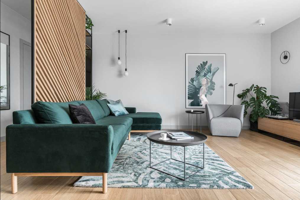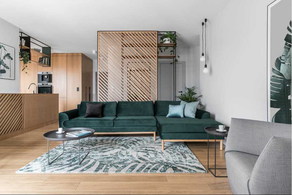 ▲在室內(nèi)的任一處,都可以感受到設(shè)計師安排下的自然氣息,淺色的木質(zhì)地板,森林綠色的天鵝絨沙發(fā),甚至是植物的樹葉也被應(yīng)用于墻面上的裝飾畫或是地面的地毯。