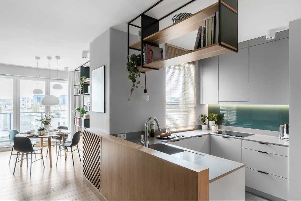 ▲定制的轉(zhuǎn)交櫥柜充分利用空間的角落,綠色的延伸與整體互相呼應(yīng)。