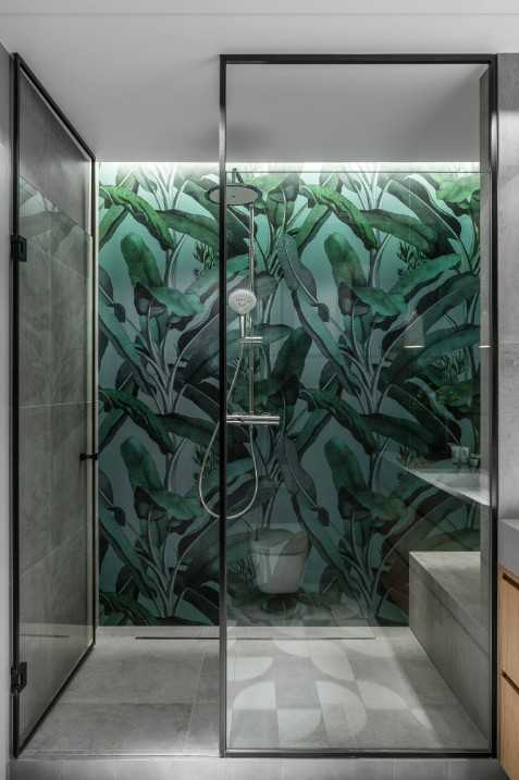▲洗浴室在綠色的基礎(chǔ)上,增加了植物的圖案,更加呼應(yīng)了室內(nèi)的自然氣息。
