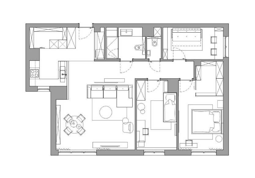 ▲定制的鏤空隔斷與黑色金屬很好的相融,采光與私密得到平衡,并在過道處設(shè)置了公共洗手間。