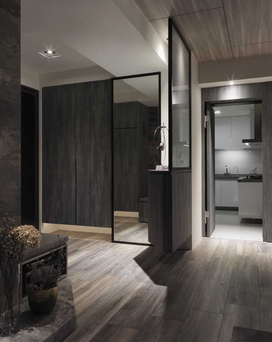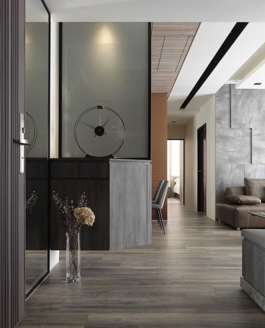 玄關(guān)處屏風與墻面轉(zhuǎn)角空間打造的懸柜,增加收納機能同時作為藝術(shù)質(zhì)感端景。