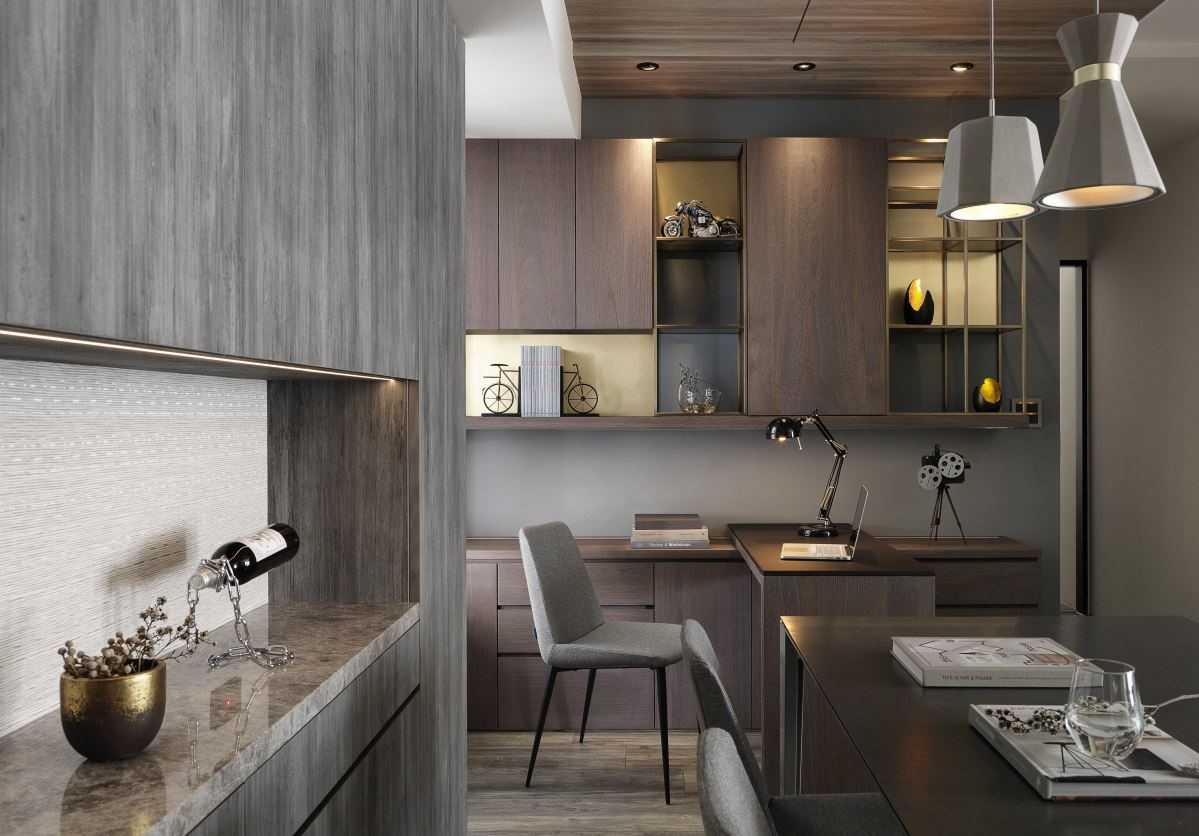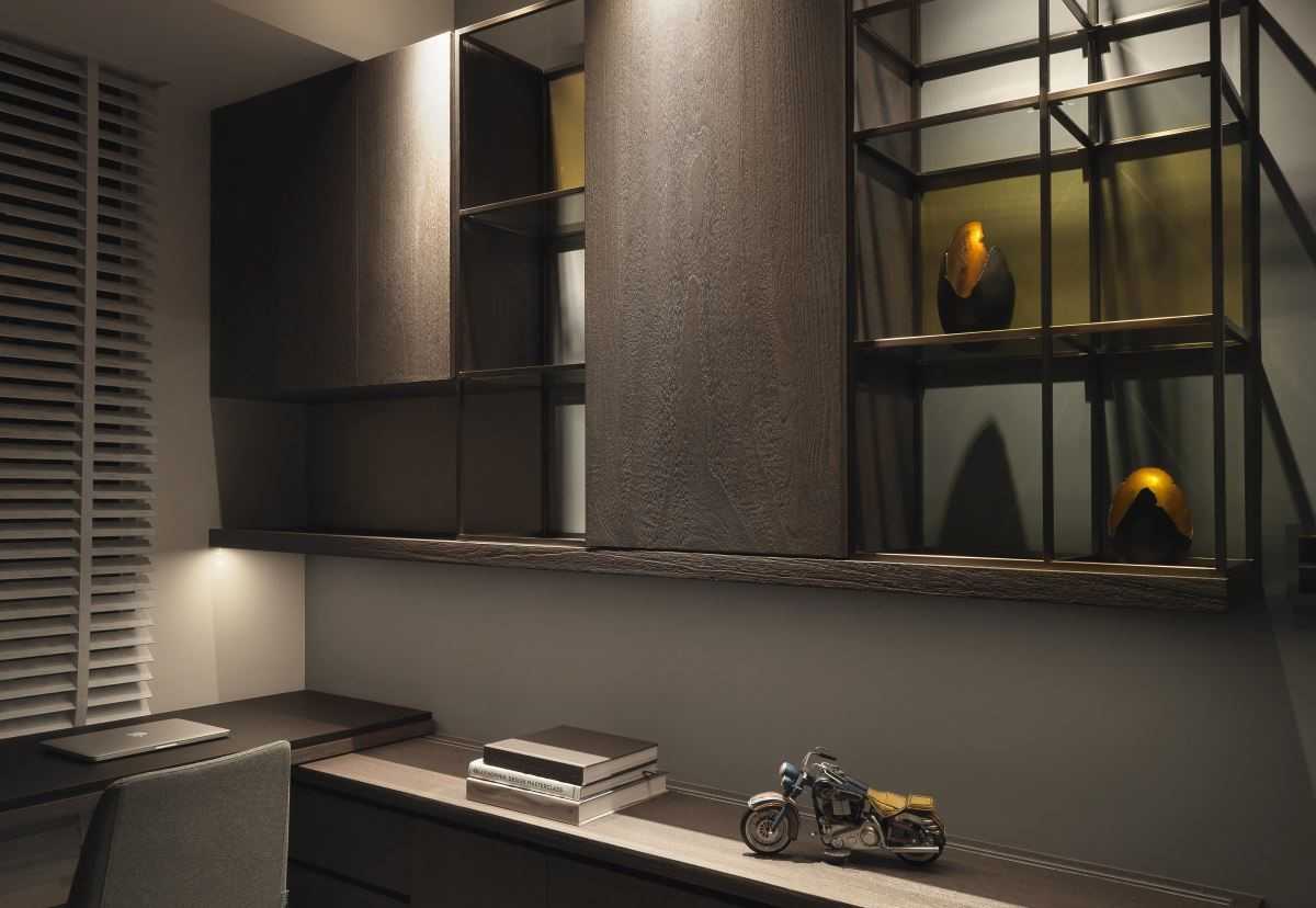 公領(lǐng)域依據(jù)屋主生活習(xí)慣,增設(shè)一開放式書房,平行餐桌的鋪排讓視線及生活動線更加利落、順暢,在餐桌與書房區(qū)之間設(shè)計的活動式幕簾,讓開放式書房也能享有與世隔絕的專心氛圍。