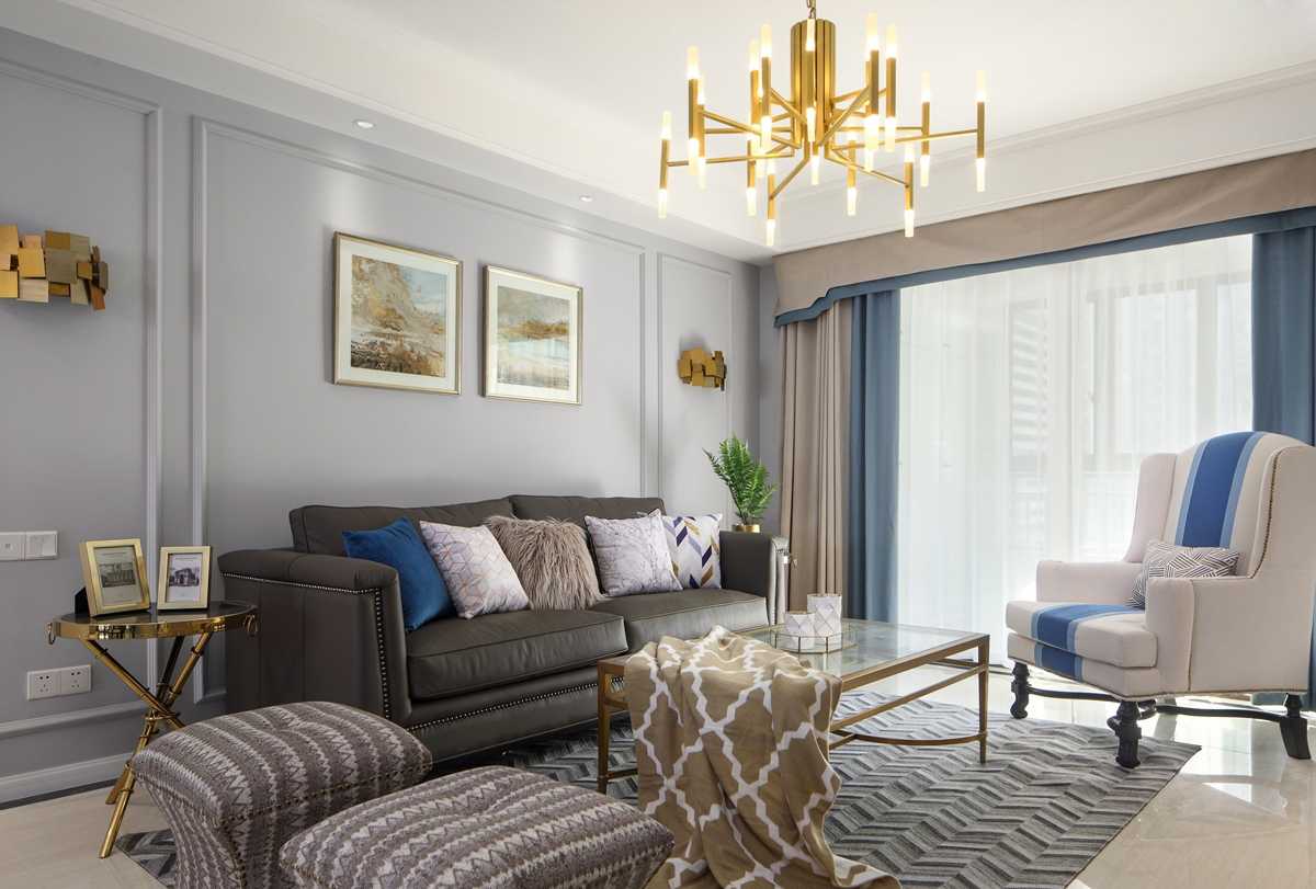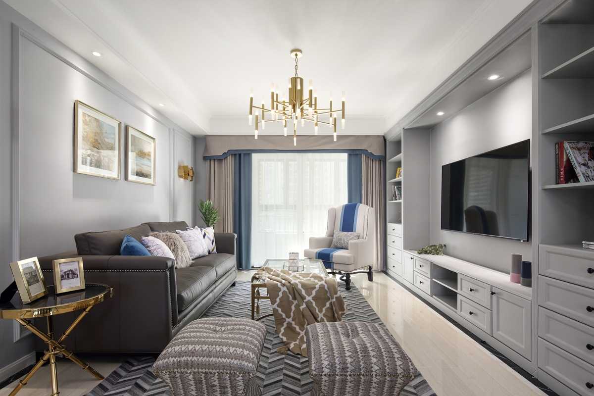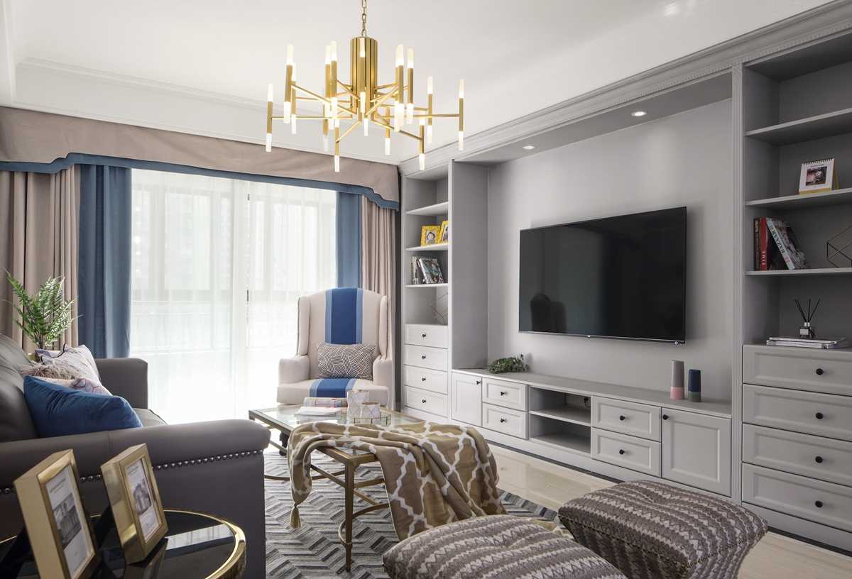 灰色的護(hù)墻板和兼具儲物柜功能的電視背景墻搭配金色的家具,低調(diào)與奢華相互平衡,帶來別樣的美式感受。柔美的藍(lán)色點綴其中,打破了美式的陳舊的同時也豐富了客廳空間的色彩。