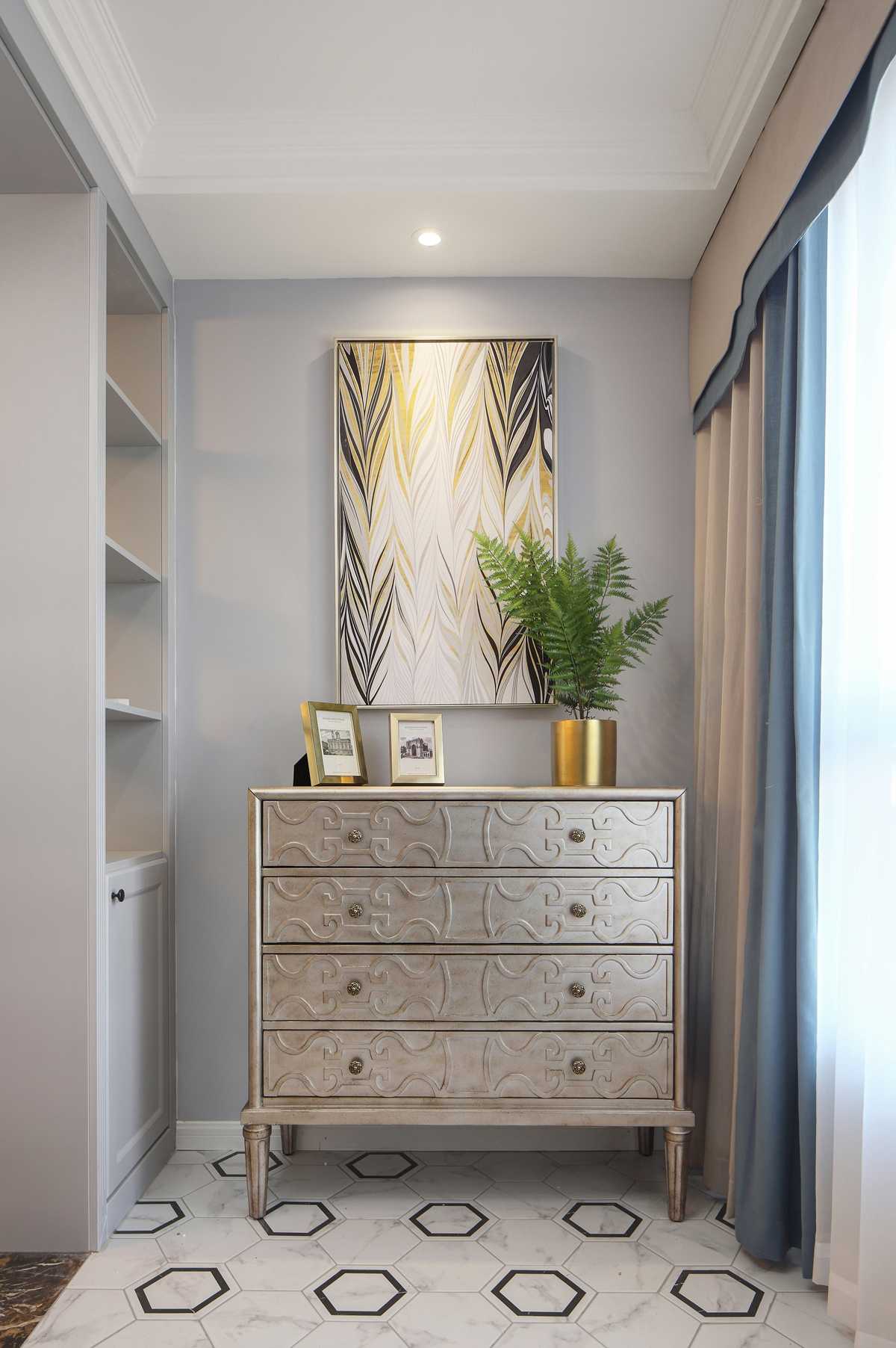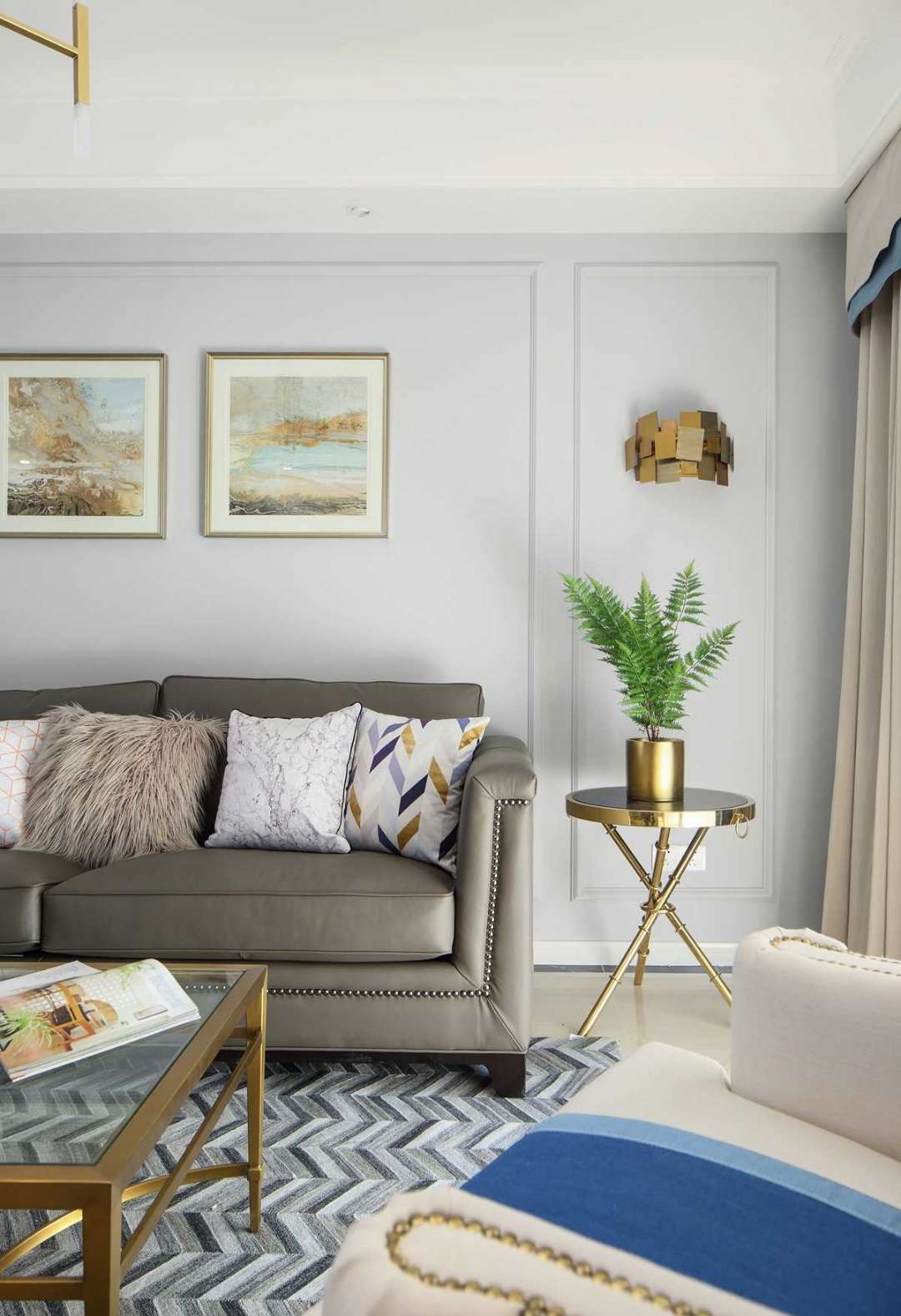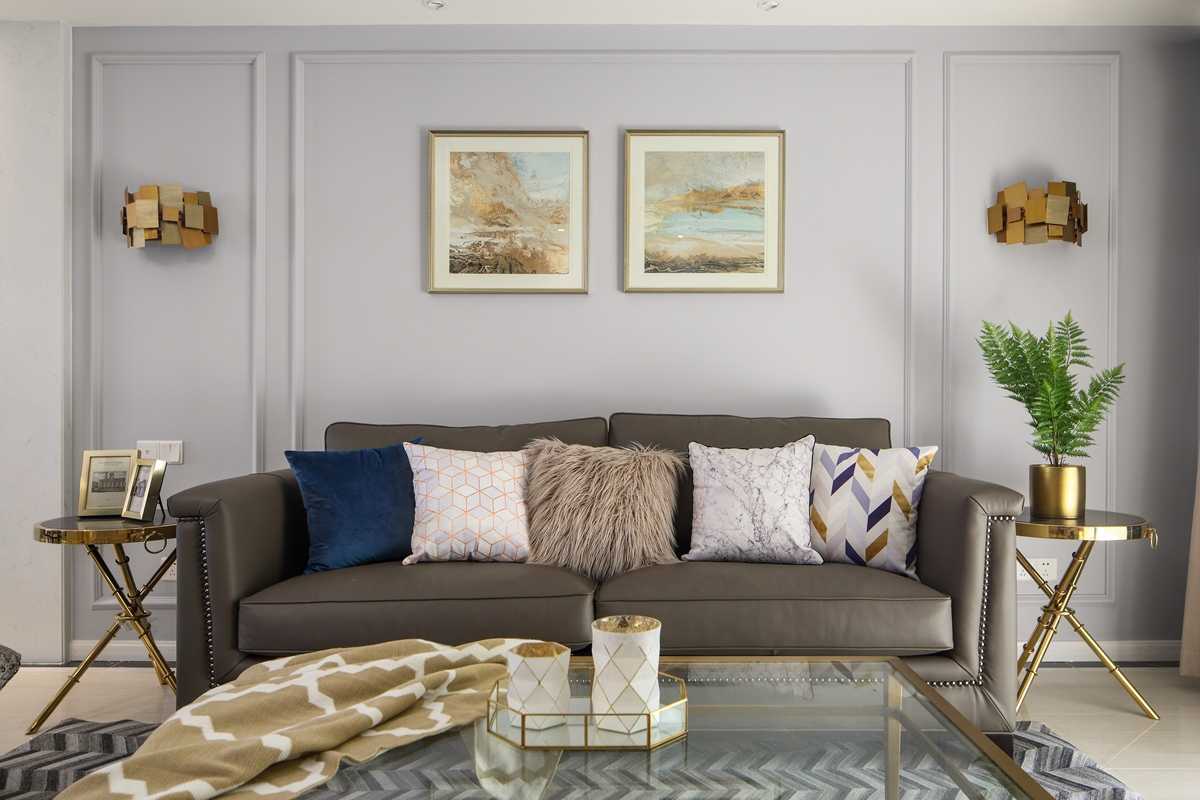 在沙發(fā)背景墻這邊,設(shè)計師并沒有像傳統(tǒng)美式那樣,用多么復(fù)雜的造型,只是以簡單的線條劃分,金色和灰色的搭配,整體大氣簡約符合當(dāng)下年輕人的審美。