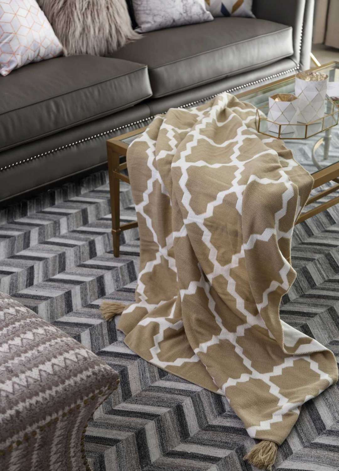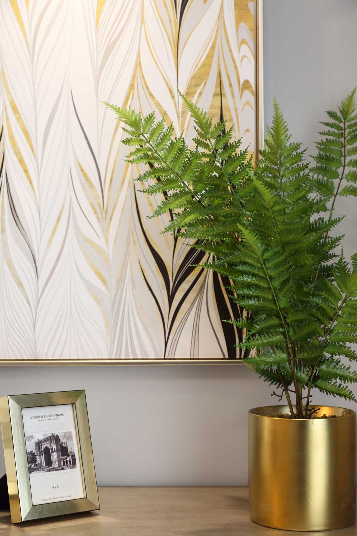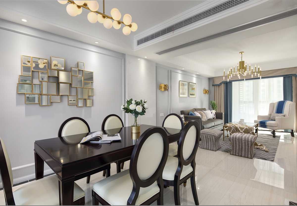 在沙發(fā)背景墻這邊,設(shè)計師并沒有像傳統(tǒng)美式那樣,用多么復(fù)雜的造型,只是以簡單的線條劃分,金色和灰色的搭配,整體大氣簡約符合當(dāng)下年輕人的審美。