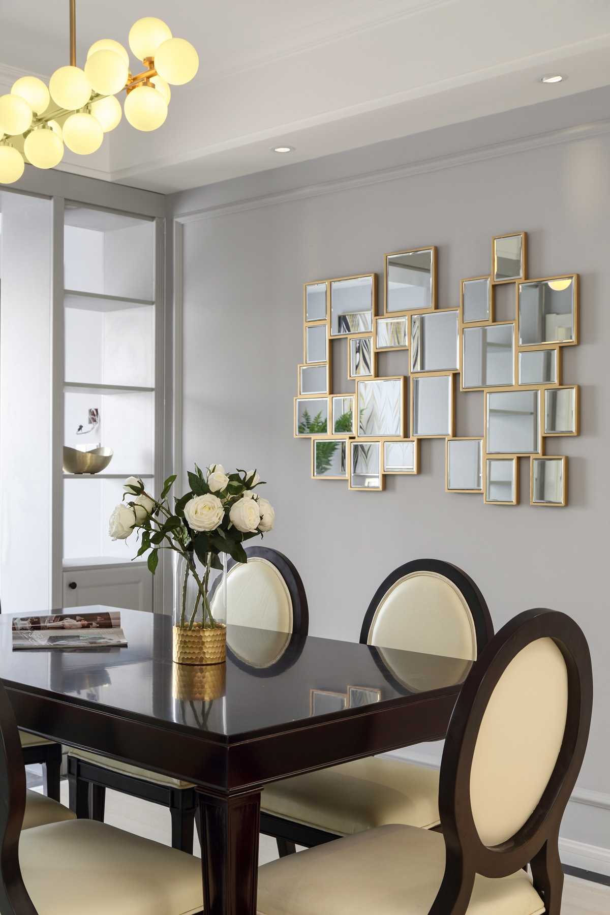 餐廳與客廳間沒有影響采光的隔斷,以吊頂和背景墻來劃分不同的功能區(qū)域,從視覺上拓寬了餐廳的視野。金屬邊框的不規(guī)則鏡子,活躍了氛圍的同時,點亮了單調(diào)的背景。