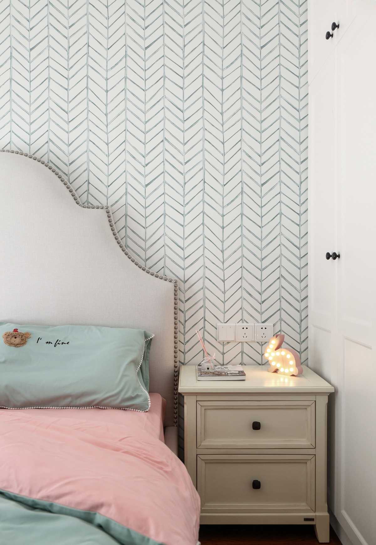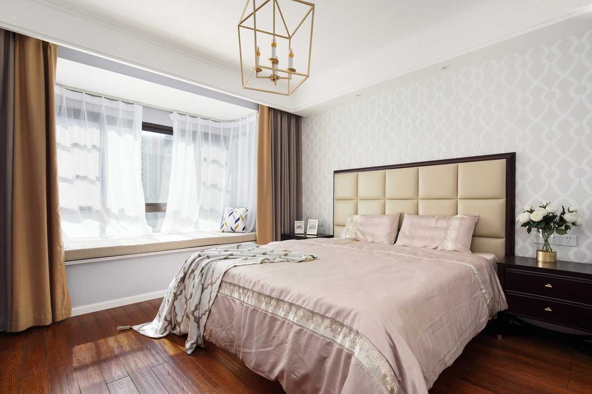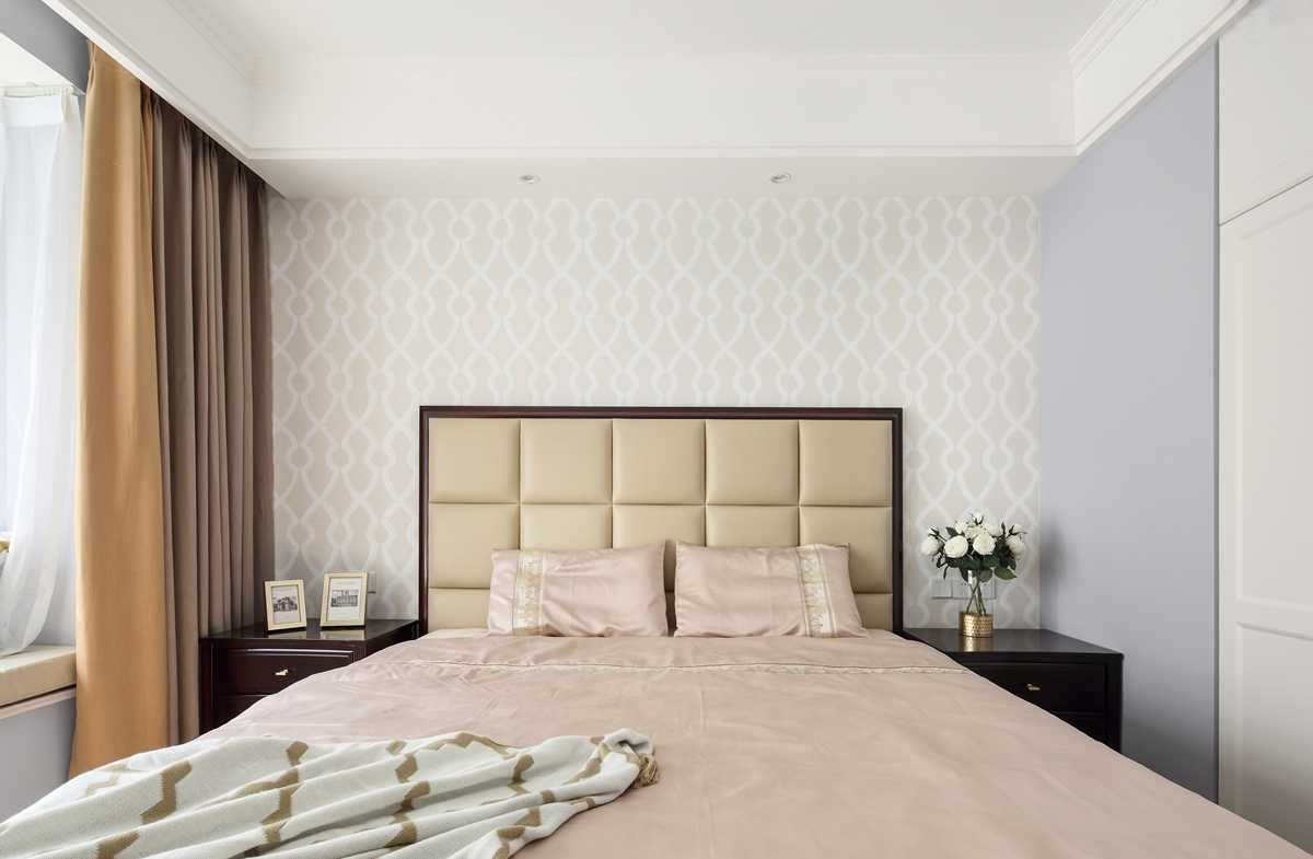 淺色系幾何圖案壁紙,襯托出美式家具的質(zhì)感。柔和的主臥色彩給人以舒適的視覺感受,床品也以舒適為主,體現(xiàn)輕奢美式的細(xì)節(jié)。