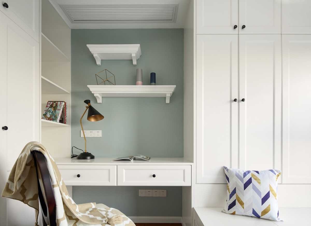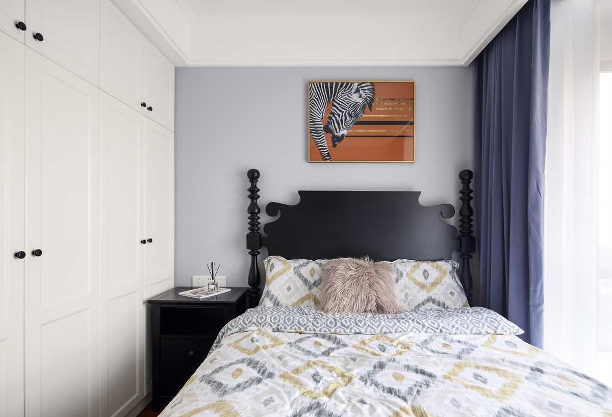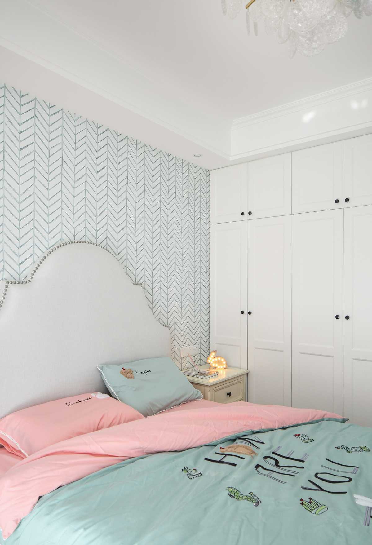 淺色系幾何圖案壁紙,襯托出美式家具的質(zhì)感。柔和的主臥色彩給人以舒適的視覺感受,床品也以舒適為主,體現(xiàn)輕奢美式的細(xì)節(jié)。