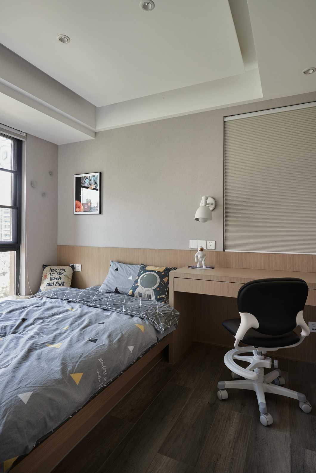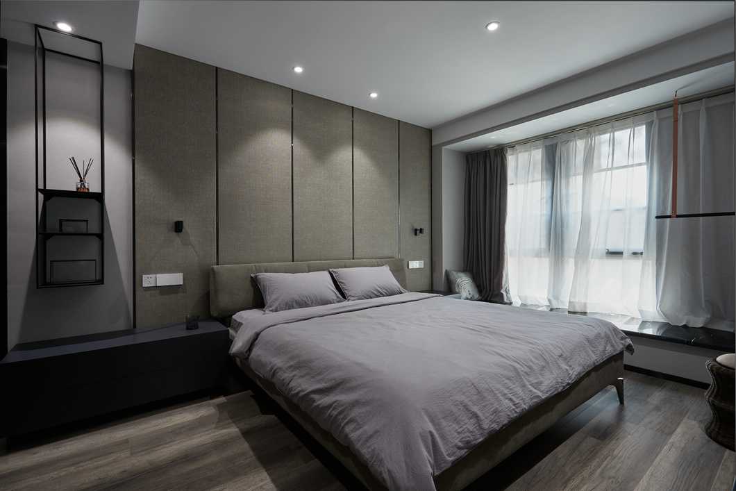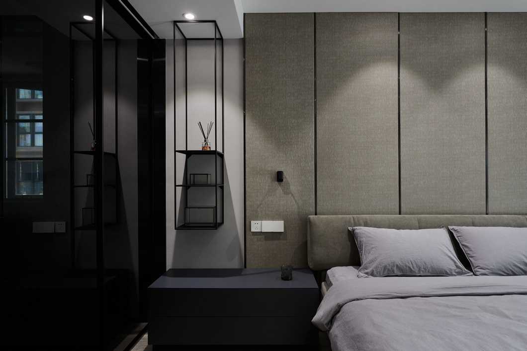 主臥的色調(diào)略顯深邃,灰色的墻紙與深色家具靜謐感十足。公區(qū)的縱向線(xiàn)條感被換了形式的引入進(jìn)來(lái),設(shè)計(jì)思路貫穿其中。