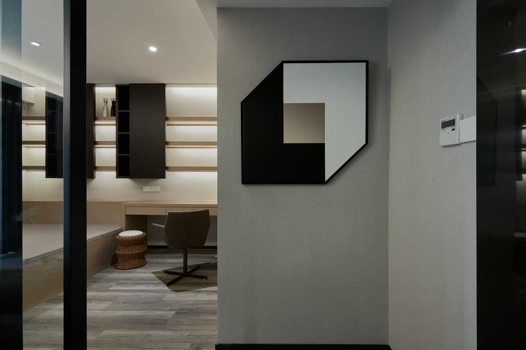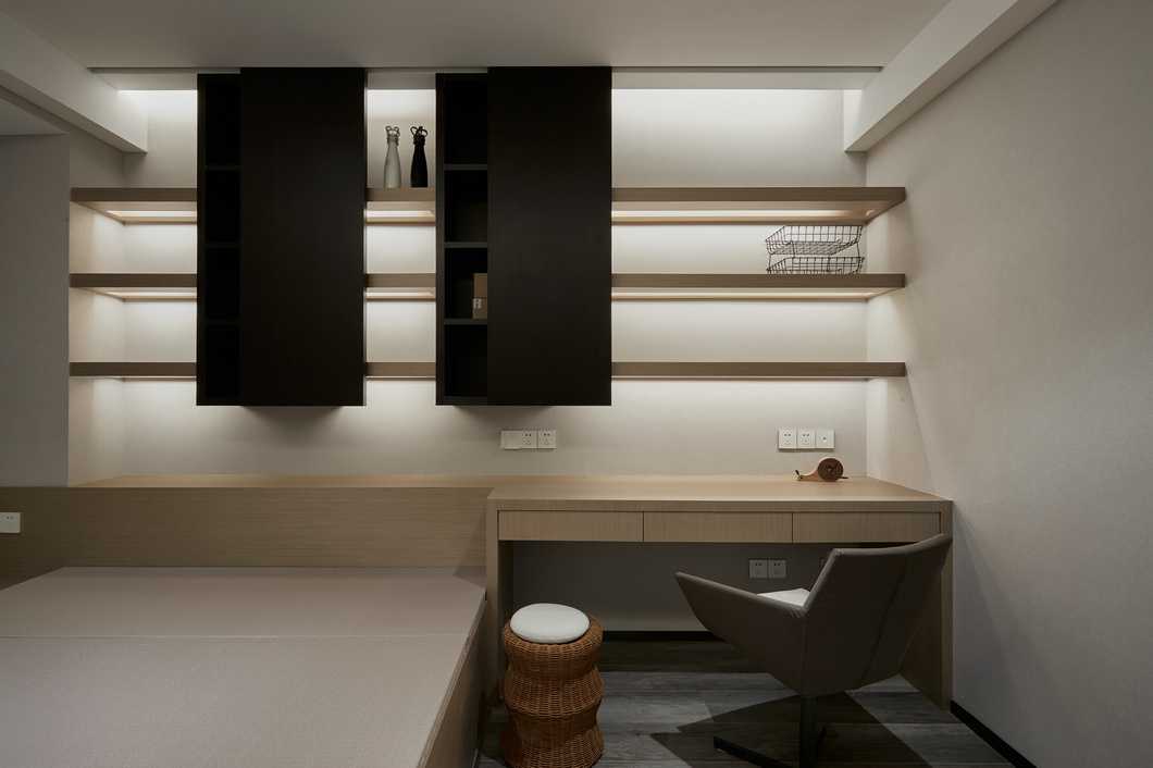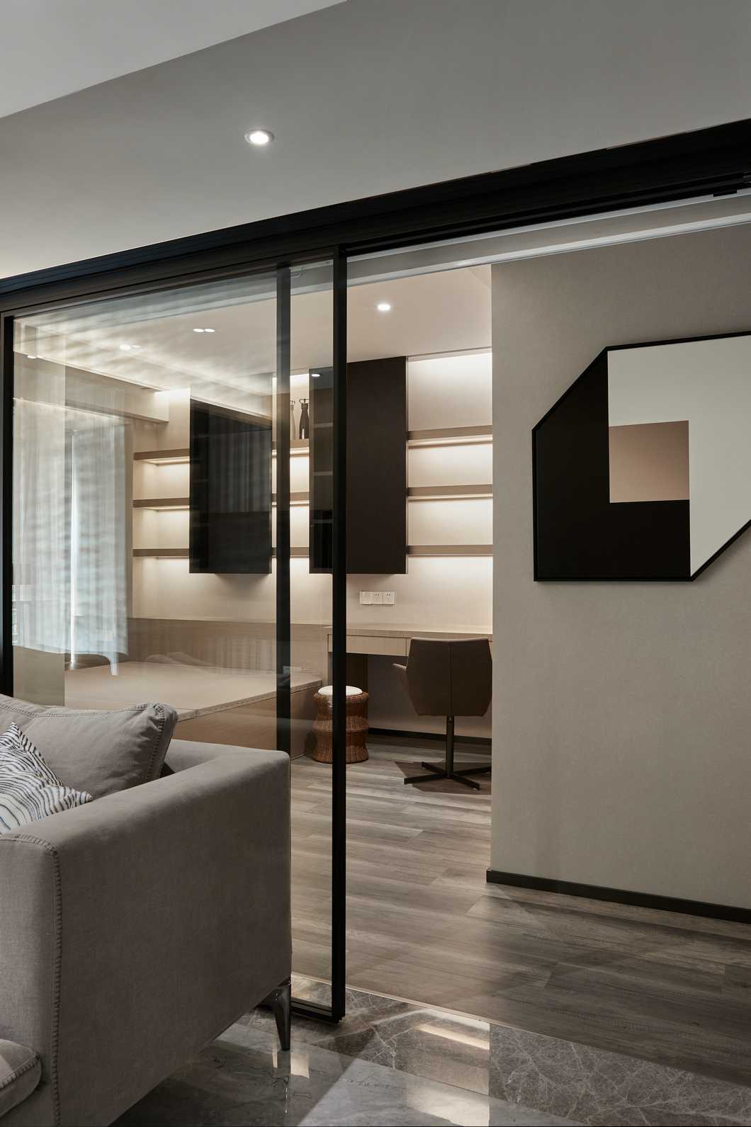 書(shū)房于客廳僅一扇移門(mén)為界,通透的玻璃讓兩個(gè)空間保持獨(dú)立的同時(shí)增加了許多互動(dòng)感,釋放了空間的可能性